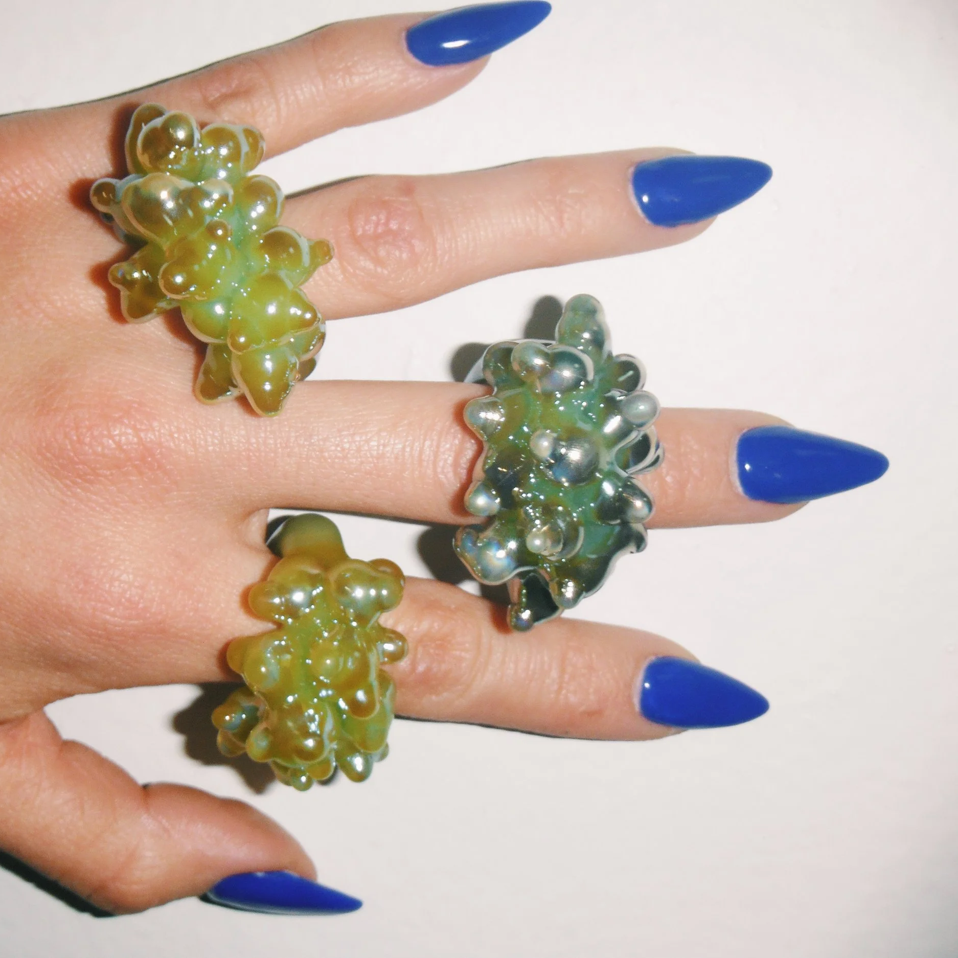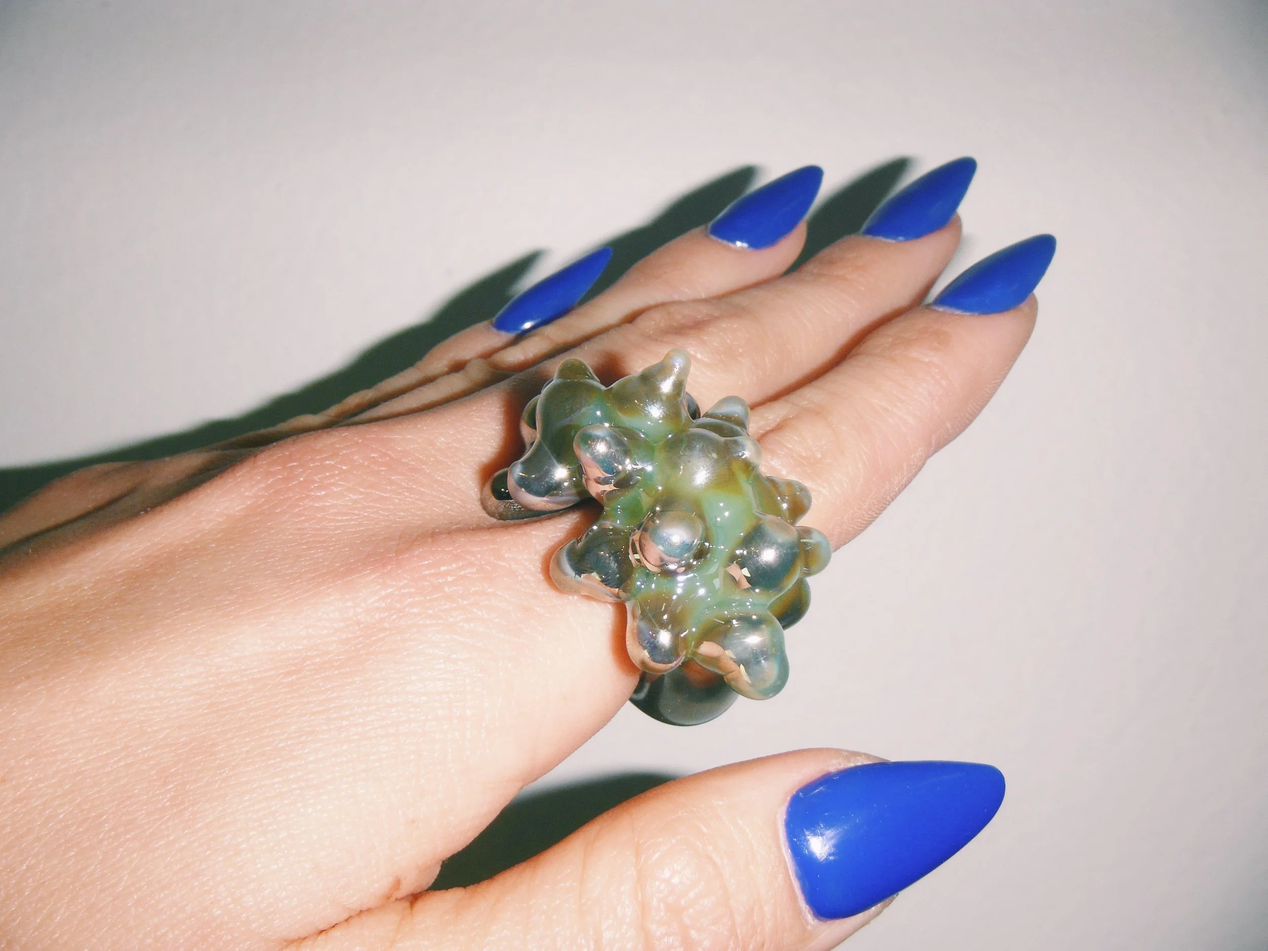 Anillo de vidrio soplado negro con picos y efecto especial. / Black blown glass ring with spikes and special effect.